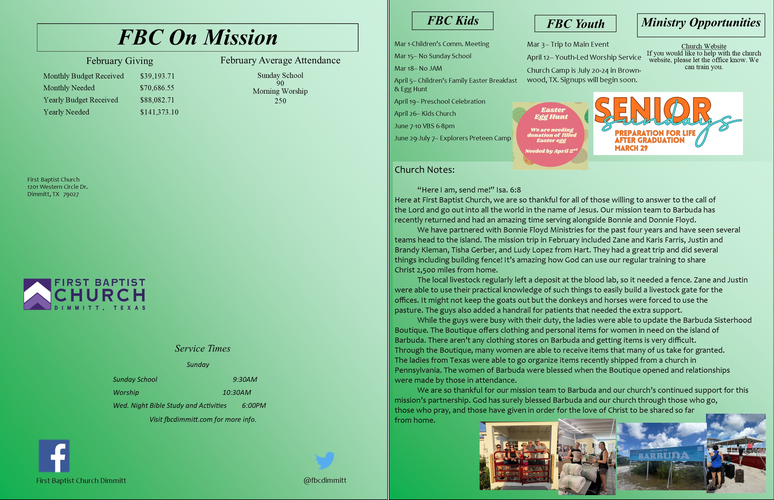 At First Baptist Church Dimmitt we want to know Jesus Christ and make Him known to the world. We welcome you to join us in this endeavor. Whether on Sunday morning, Sunday evening or Wednesday evening you can expect to find biblically sound teaching with everyday application, spirit-filled worship through song, and hearts united in prayer. We are regular people coming together to glorify a loving and gracious God. Come as you are and join us as we seek to know Him and make Him known.